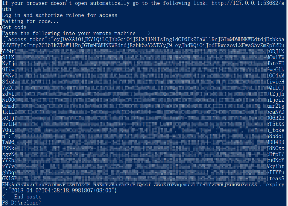 rclone authorize "onedrive"连接OneDrive。根据提示命令行提示,用浏览器打开 http://127.0.0.1:53682/auth,登录OneDrive账户信息,把token拿到。(很长的一大段)