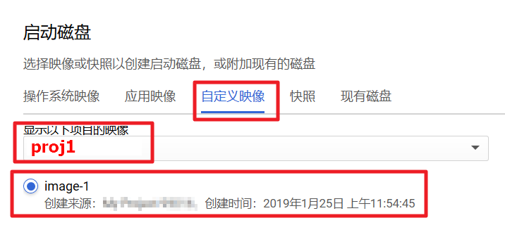 三、在proj2中,创建实例,硬盘选择自定义映像