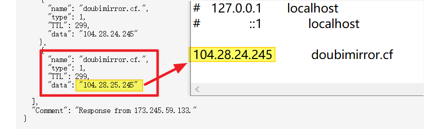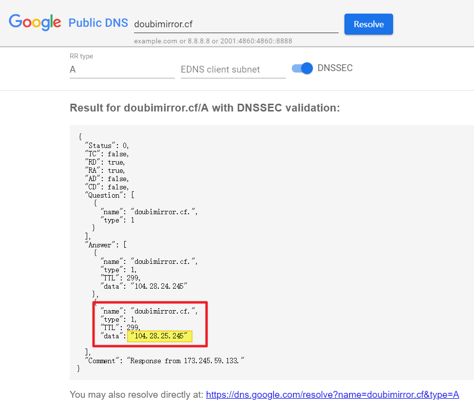 在dns.google.com查询doubimirror.cf,以最后一次为准,得到的是 104.28.25.245