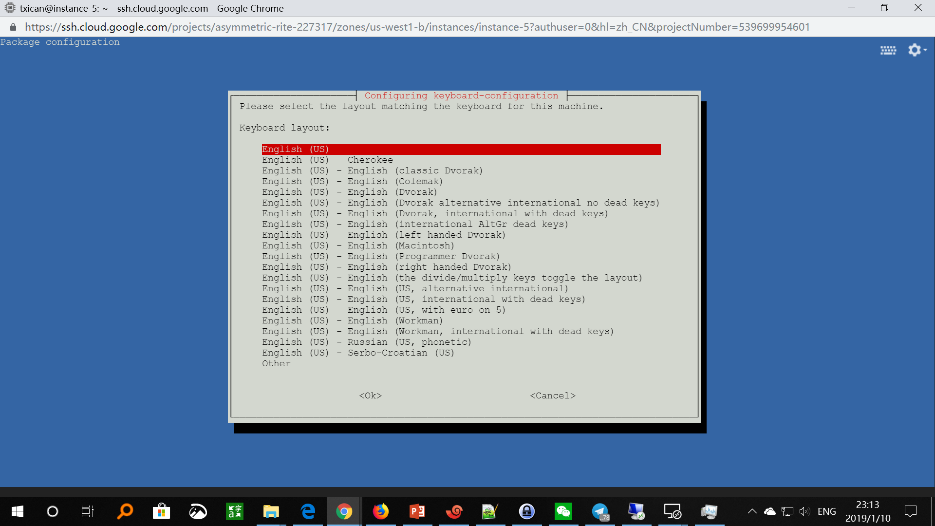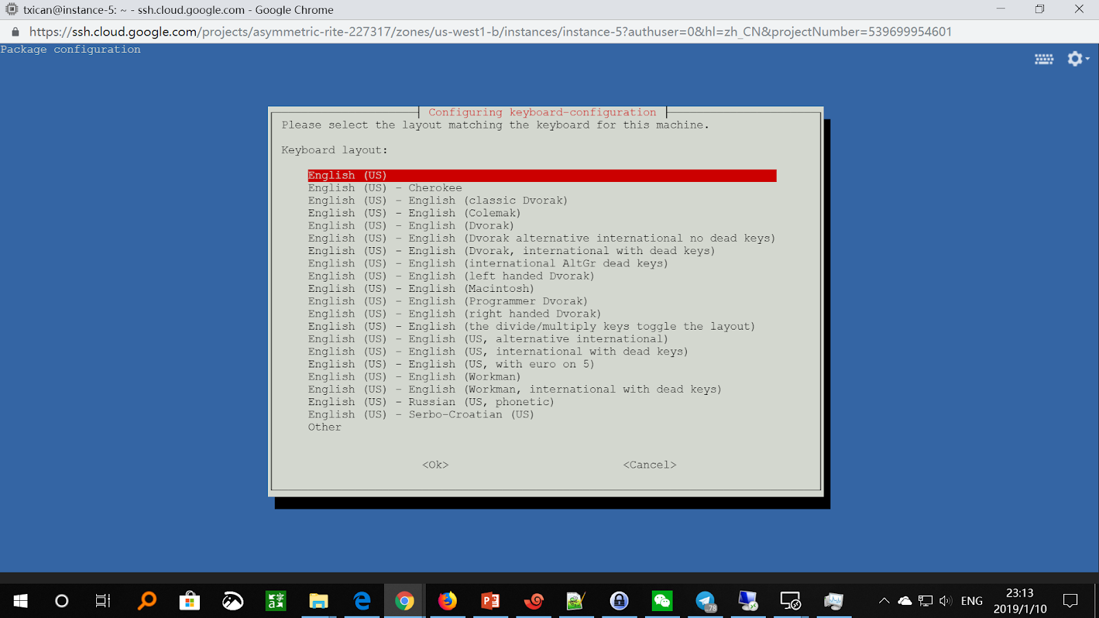 脚本跑起来大约2、3分钟的时候,需要选择键盘类型,直接按回车选默认的US就好。