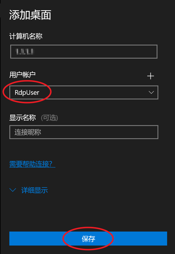 选择刚刚添加的账户RdpUser,保存这个远程桌面。