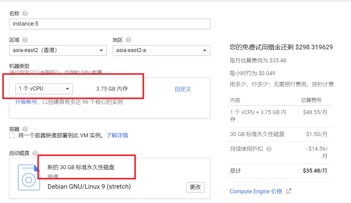 GCP创建实例至少选 n1-normal-1这个级别,CPU内存再小的VPS搭出来非常非常卡。硬盘不要太小,搭完环境硬盘用掉约10GB。