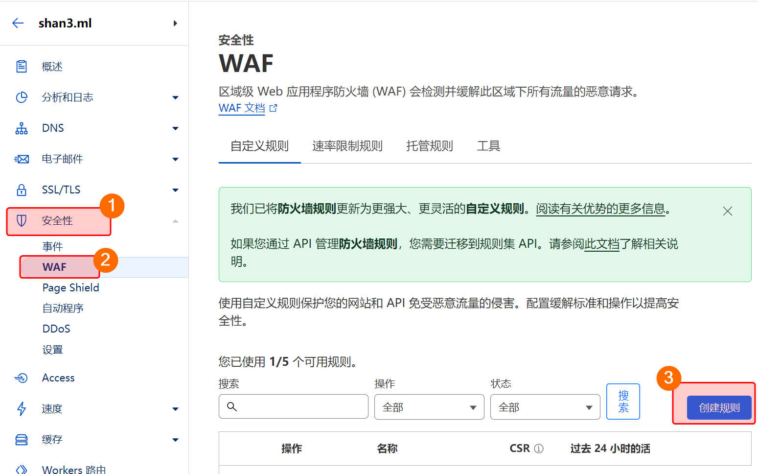 Cloudflare界面有所变化,现在在 安全性 里面 的 WAF 创建规则
