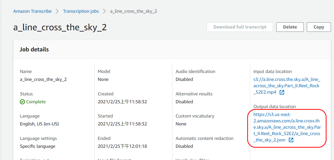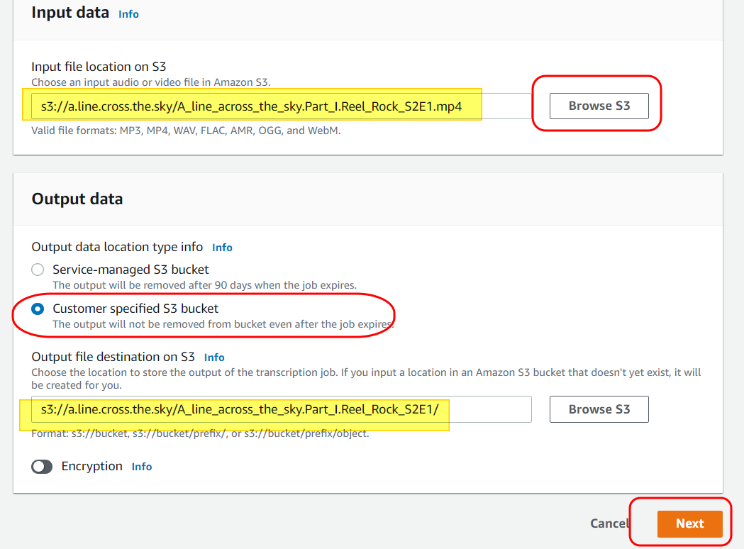 Input从S3中选择要处理的影音文件,Output让Transcribe的处理结果放到我们自己的存储桶里。“下一步”。