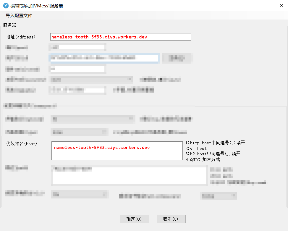 然后在v2rayN的配置里,地址(address)和伪装域名(host)都填写为worker的域名。其它配置项不变。