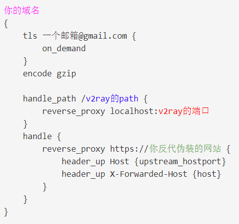 你的域名 # 改这里{encode gziphandle_path /分流path { # 改这里reverse_proxy localhost:你的v2ray内部端口 # 改这里}handle {reverse_proxy https://你反代伪装的网站 { # 改这里trusted_proxies 0.0.0.0/0header_up Host {upstream_hostport}}}}