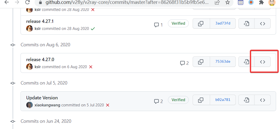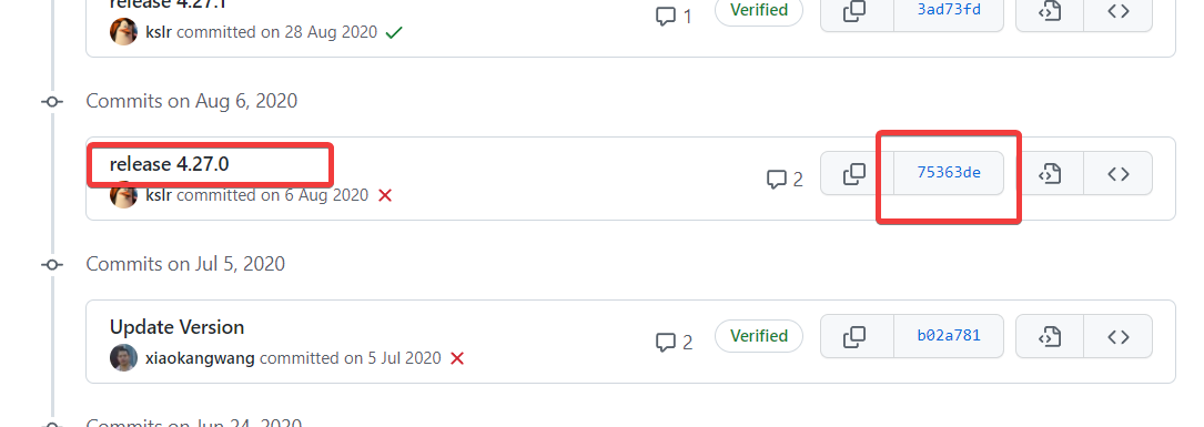 查看全部修改记录根据提交说明文字和你对v4.27.0的发布日期进行检索。找到对应的快照编号 75363de3. 点击 <> 这个按钮,查看快照 75363de 当时的全部文件