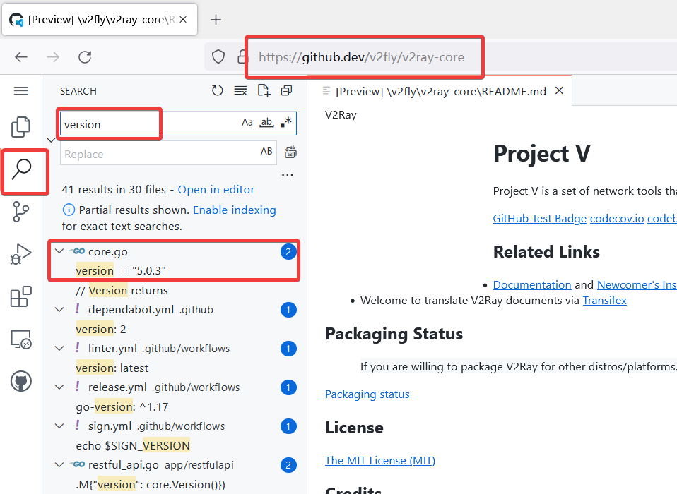 把 repo 的 url "https://github.com/v2fly/v2ray-core" 换成 "https://github.dev/v2fly/v2ray-core",访问它就可以用 VS Code Online 编辑代码。