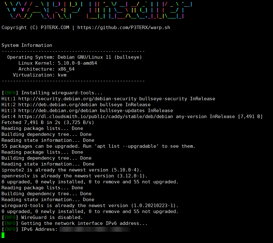 后来有人反馈在其它母鸡上(比如EU-2) 跑我这个脚本还是不行。我发现是访问api.github.com出错。于是我用了一个终极的笨办法——把跑此脚本要用到的资源都搬到了repo上,通过raw.githubusercontents.com下载。当然这样的坏处就是wgcf的版本无法做到同步更新了。不过对于只是为了搭个warp打通IPv4的人来说,应该影响不大。如果哪天不行了,再手动同步到repo就好了。