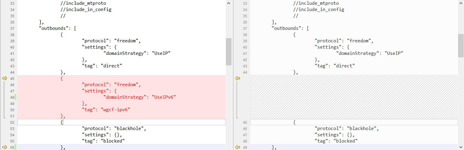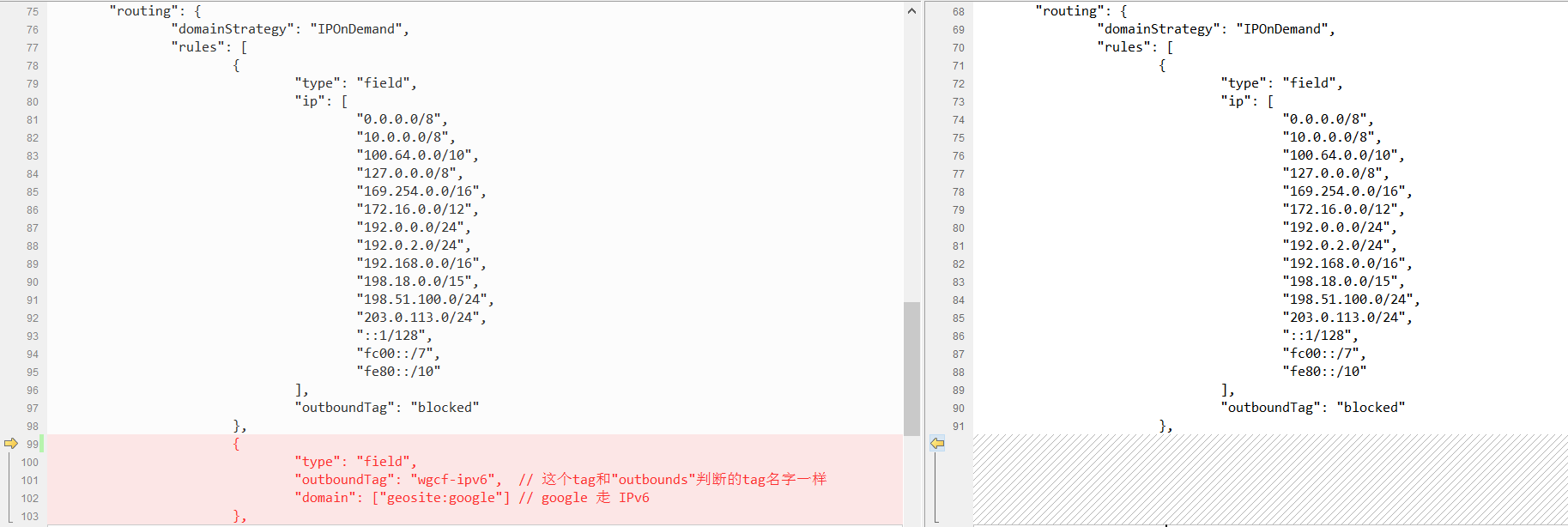 "outboundTag": "wgcf-ipv6",  // 这个tag和"outbounds"判断的tag名字一样