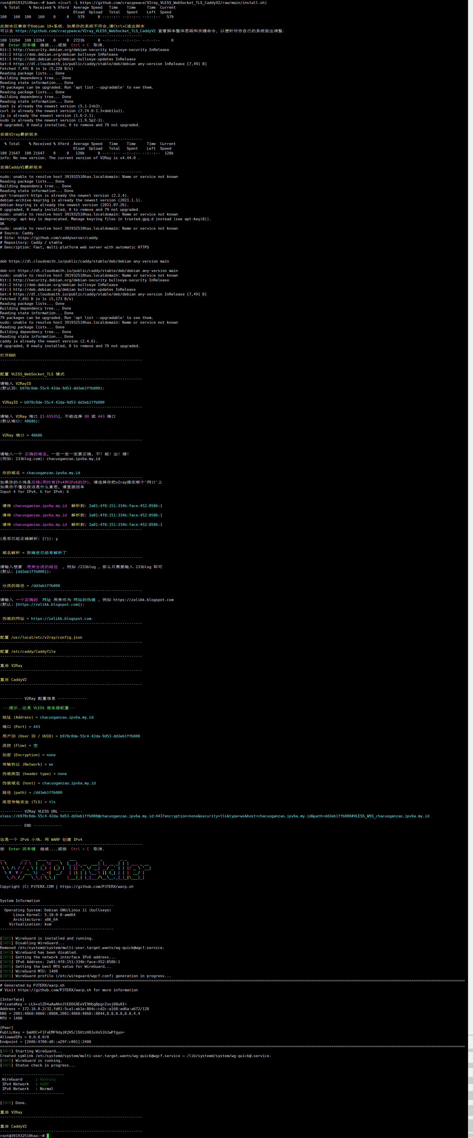 root@391932510hax:~# apt updateapt install -y curlroot@391932510hax:~# apt updateapt install -y curlbash <(curl -L https://github.com/crazypeace/V2ray_VLESS_WebSocket_TLS_CaddyV2/raw/main/install.sh)Hit:1 http://deb.debian.org/debian bullseye InReleaseHit:2 http://security.debian.org/debian-security bullseye-security InReleaseGet:3 http://deb.debian.org/debian bullseye-updates InRelease [39.4 kB]Get:4 https://dl.cloudsmith.io/public/caddy/stable/deb/debian any-version InRelease [7,491 B]Fetched 46.8 kB in 2s (30.9 kB/s)Reading package lists... DoneBuilding dependency tree... DoneReading state information... Done79 packages can be upgraded. Run 'apt list --upgradable' to see them.Reading package lists... DoneBuilding dependency tree... DoneReading state information... Donecurl is already the newest version (7.74.0-1.3+deb11u1).0 upgraded, 0 newly installed, 0 to remove and 79 not upgraded.% Total % Received % Xferd Average Speed Time Time Time CurrentDload Upload Total Spent Left Speed100 160 100 160 0 0 124 0 0:00:01 0:00:01 --:--:-- 124此脚本仅兼容于Debian 10+系统. 如果你的系统不符合,请Ctrl+C退出脚本可以去 https://github.com/crazypeace/V2ray_VLESS_WebSocket_TLS_CaddyV2 查看脚本整体思路和关键命令, 以便针对你自己的系统做出调整.----------------------------------------------------------------100 13292 100 13292 0 0 9036 0 0:00:01 0:00:01 --:--:-- 9036按 Enter 回车键 继续....或按 Ctrl + C 取消.Hit:1 http://security.debian.org/debian-security bullseye-security InReleaseHit:2 http://deb.debian.org/debian bullseye InReleaseHit:3 http://deb.debian.org/debian bullseye-updates InReleaseGet:4 https://dl.cloudsmith.io/public/caddy/stable/deb/debian any-version InRelease [7,491 B]Fetched 7,491 B in 2s (4,232 B/s)Reading package lists... DoneBuilding dependency tree... DoneReading state information... Done79 packages can be upgraded. Run 'apt list --upgradable' to see them.Reading package lists... DoneBuilding dependency tree... DoneReading state information... Donebash is already the newest version (5.1-2+b3).curl is already the newest version (7.74.0-1.3+deb11u1).jq is already the newest version (1.6-2.1).sudo is already the newest version (1.9.5p2-3).0 upgraded, 0 newly installed, 0 to remove and 79 not upgraded.安装V2ray最新版本----------------------------------------------------------------% Total % Received % Xferd Average Speed Time Time Time CurrentDload Upload Total Spent Left Speed100 21647 100 21647 0 0 81686 0 --:--:-- --:--:-- --:--:-- 81686info: No new version. The current version of V2Ray is v4.44.0 .安装CaddyV2最新版本----------------------------------------------------------------sudo: unable to resolve host 391932510hax.localdomain: Name or service not knownReading package lists... DoneBuilding dependency tree... DoneReading state information... Doneapt-transport-https is already the newest version (2.2.4).debian-archive-keyring is already the newest version (2021.1.1).debian-keyring is already the newest version (2021.07.26).0 upgraded, 0 newly installed, 0 to remove and 79 not upgraded.sudo: unable to resolve host 391932510hax.localdomain: Name or service not knownWarning: apt-key is deprecated. Manage keyring files in trusted.gpg.d instead (see apt-key(8)).OKsudo: unable to resolve host 391932511hax.localdomain: Name or service not known# Source: Caddy# Site: https://github.com/caddyserver/caddy# Repository: Caddy / stable# Description: Fast, multi-platform web server with automatic HTTPSdeb https://dl.cloudsmith.io/public/caddy/stable/deb/debian any-version maindeb-src https://dl.cloudsmith.io/public/caddy/stable/deb/debian any-version mainsudo: unable to resolve host 391932511hax.localdomain: Name or service not knownHit:1 http://security.debian.org/debian-security bullseye-security InReleaseHit:2 http://deb.debian.org/debian bullseye InReleaseHit:3 http://deb.debian.org/debian bullseye-updates InReleaseGet:4 https://dl.cloudsmith.io/public/caddy/stable/deb/debian any-version InRelease [7,491 B]Fetched 7,491 B in 2s (4,422 B/s)Reading package lists... DoneBuilding dependency tree... DoneReading state information... Done79 packages can be upgraded. Run 'apt list --upgradable' to see them.sudo: unable to resolve host 391932510hax.localdomain: Name or service not knownReading package lists... DoneBuilding dependency tree... DoneReading state information... Donecaddy is already the newest version (2.4.6).0 upgraded, 0 newly installed, 0 to remove and 79 not upgraded.