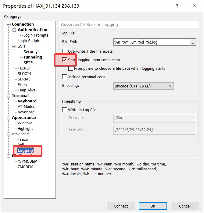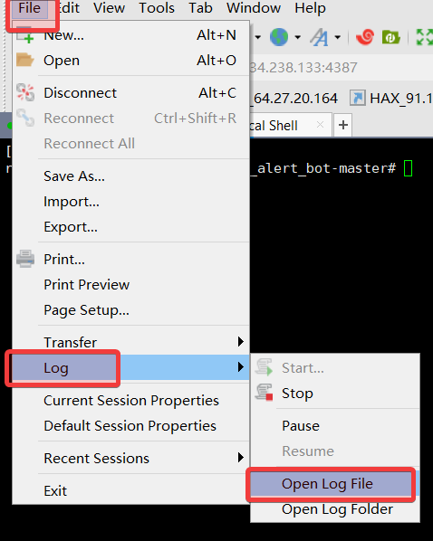 Xshell 自动记录日志 方便排错 查看相关主题: SSH Xshell 文本形式的日志比起屏幕截图,好处是方便搜索,方便前后来回翻找。而且不会出现客户漏发了日志的情况。以下截图虽然是英文界面,但是中文界面是在一样的位置上。给连接的属性配置登录时自动开始记录日志打开日志文件 评论