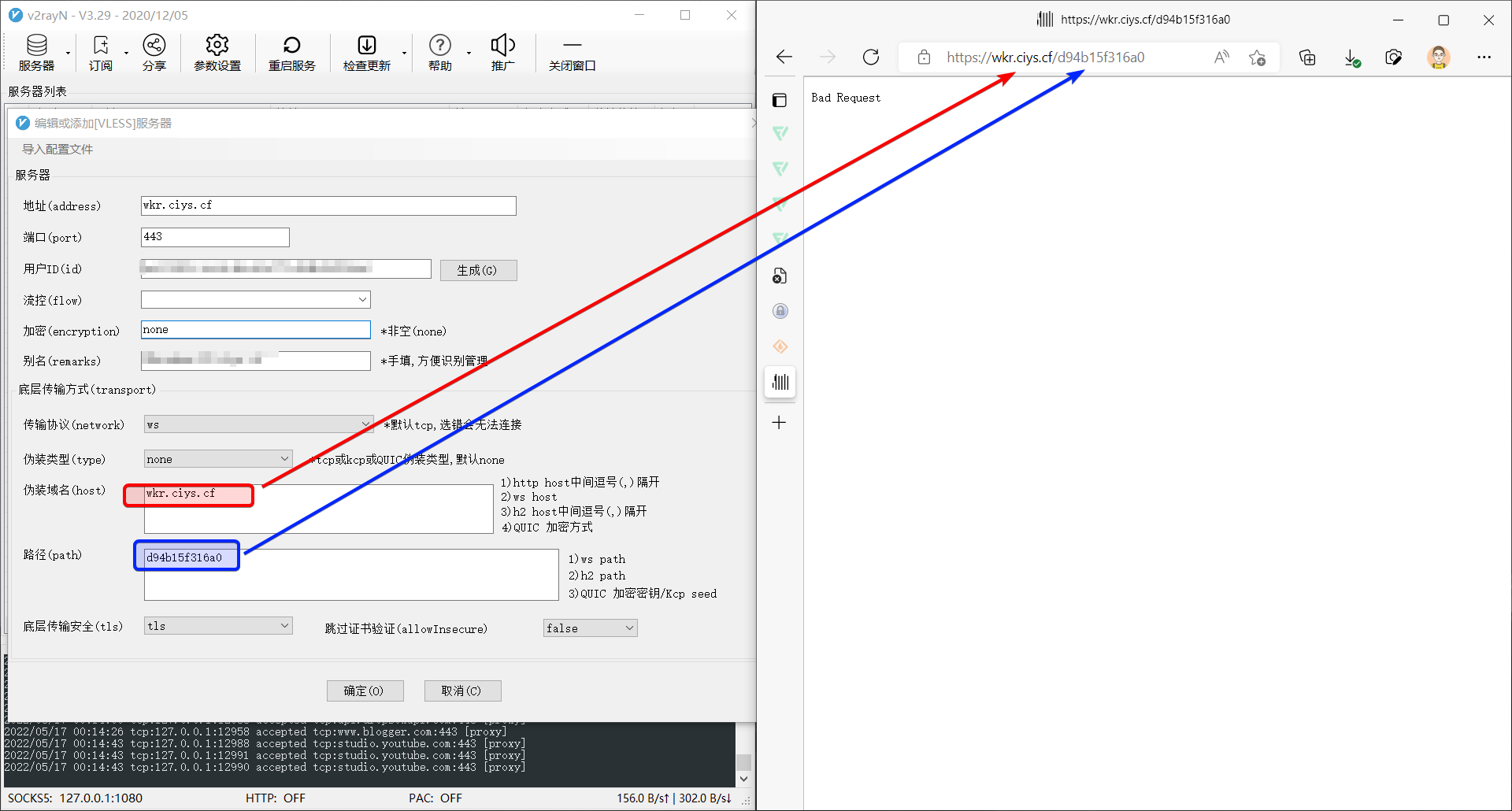 操作示例请见此视频:HTTP测试 域名/path 返回 400 Bad Request 说明 配置成功 数据流到达 V2Ray