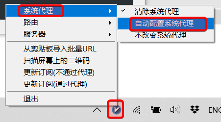 右键右下角的v2rayN图标,菜单选择 系统代理 - 自动配置系统代理