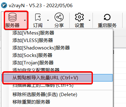在v2rayN中,点击 服务器 - 从剪贴板导入 。