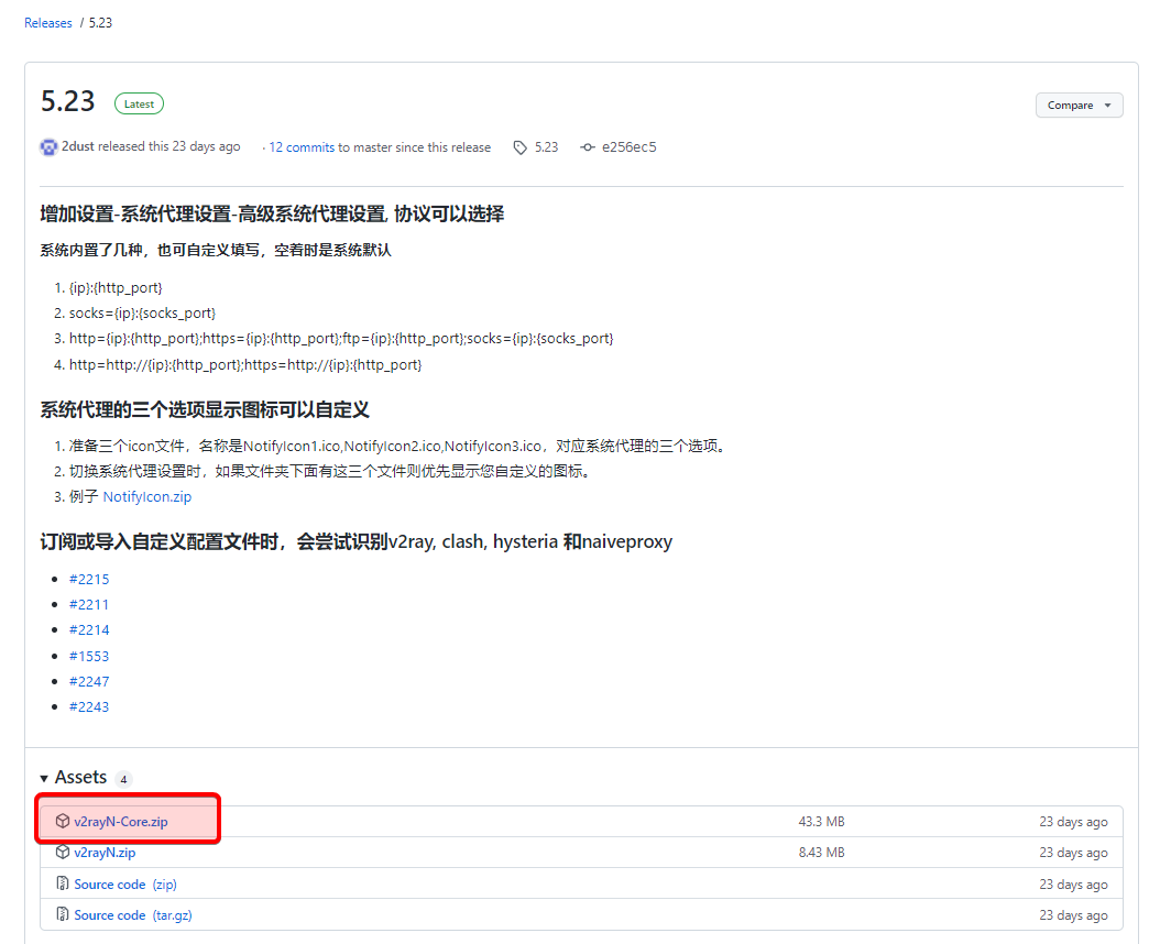 Windows V2RayN 官方下载位置 https://github.com/2dust/v2rayN/releases/latest 选择 v2rayN-Core.zip下载即可。