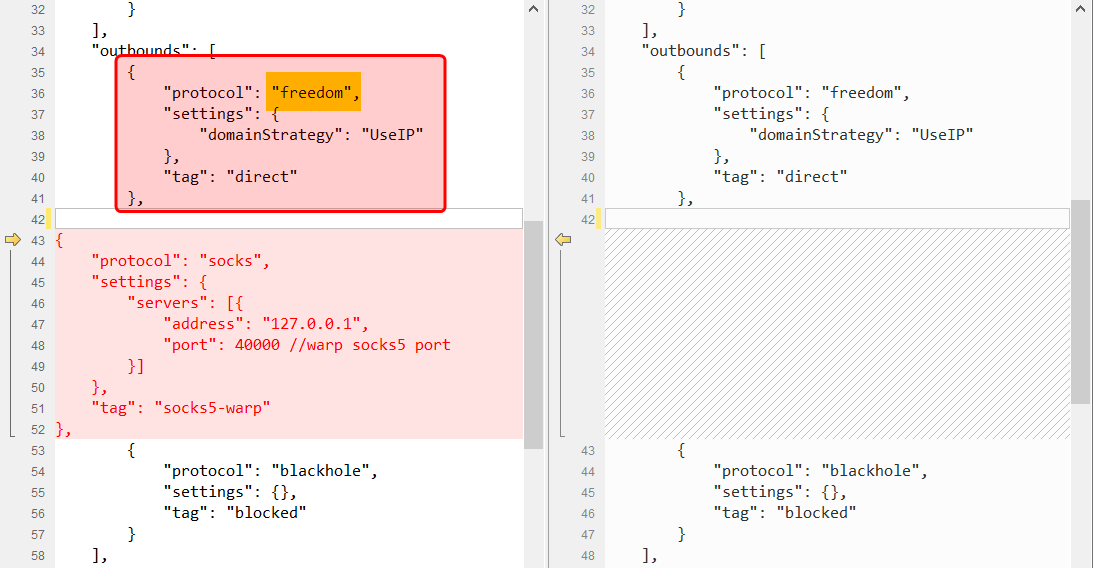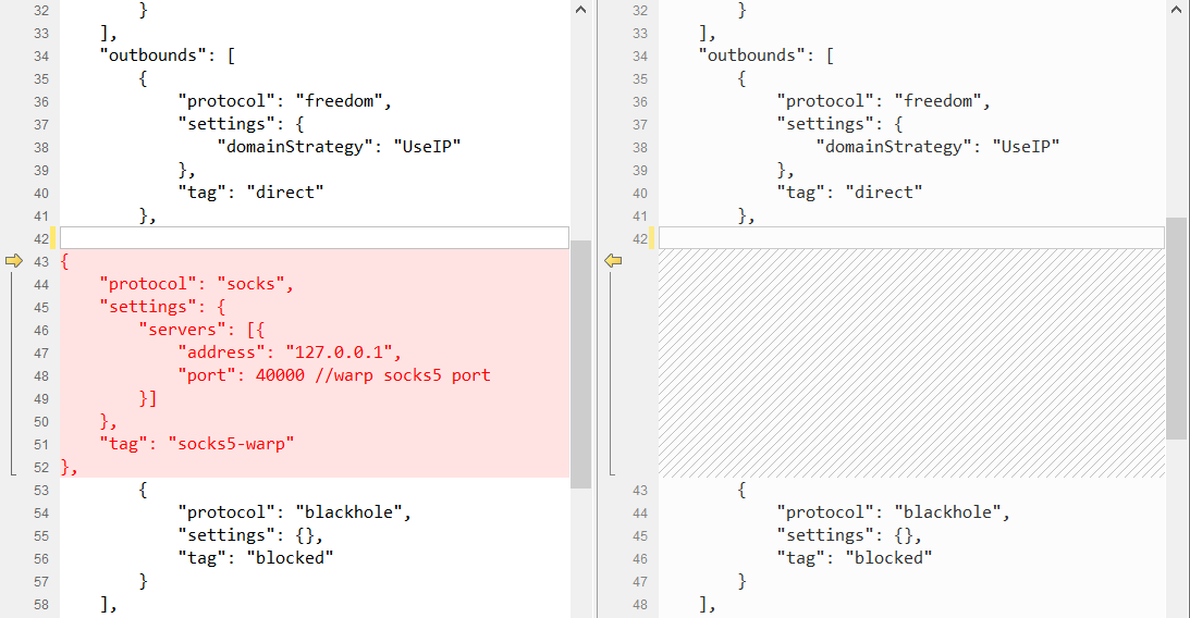 {"protocol": "socks","settings": {"servers": [{"address": "127.0.0.1","port": 40000 //warp socks5 port}]},"tag": "socks5-warp"},