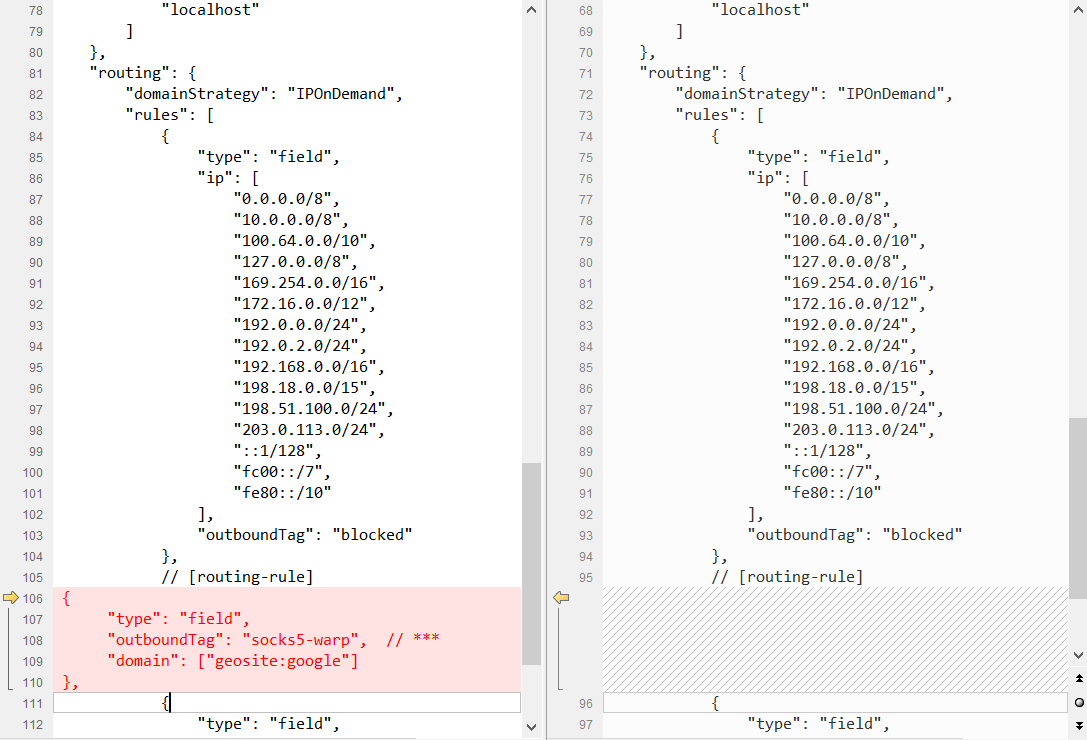 {"type": "field","outboundTag": "socks5-warp", // 这个tag和"outbounds"判断的tag名字一样"domain": ["geosite:google"] // google 单独走一个outbound},