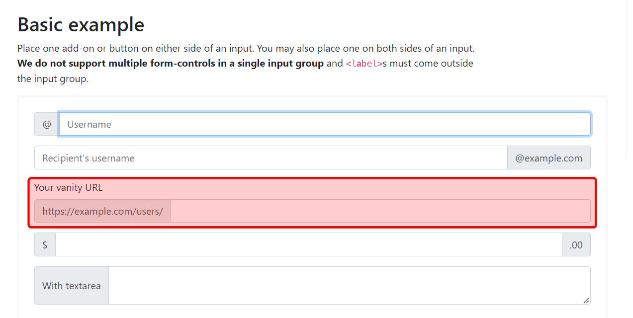 <div class="input-group mb-3"><div class="input-group-prepend"><span class="input-group-text" id="basic-addon3">https://example.com/users/</span></div><input type="text" class="form-control" id="basic-url" aria-describedby="basic-addon3"></div>