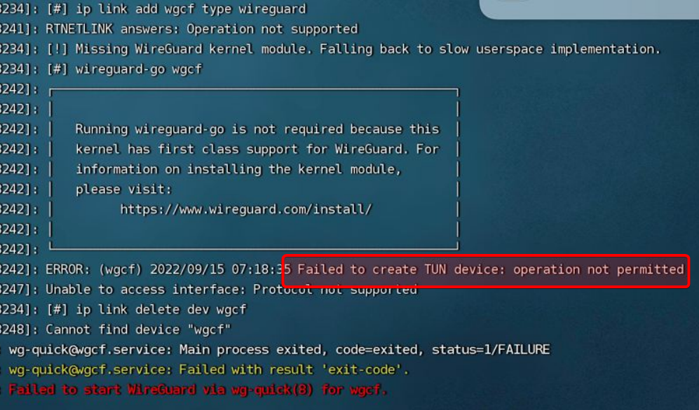 ERROR: (wgcf) 2022/09/15 07:18:35 Failed to create TUN device: operation not permitted