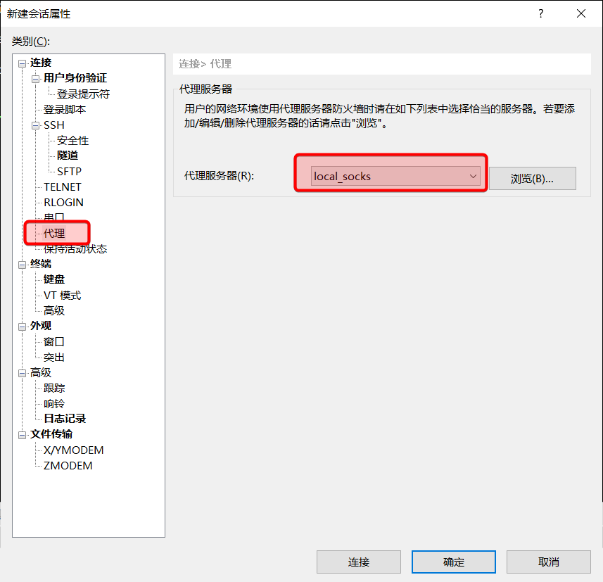 6. Xshell新建会话的代理设置,设置为本机Socks5代理