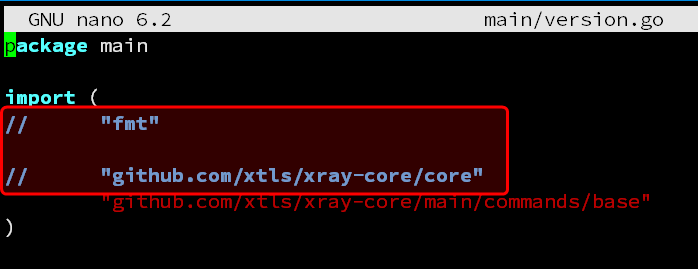 main/version.go:4:2: imported and not used: "fmt"main/version.go:24:9: s declared but not usedmain/version.go:23:2: version declared but not usedmain/version.go:6:2: imported and not used: "github.com/xtls/xray-core/core"
