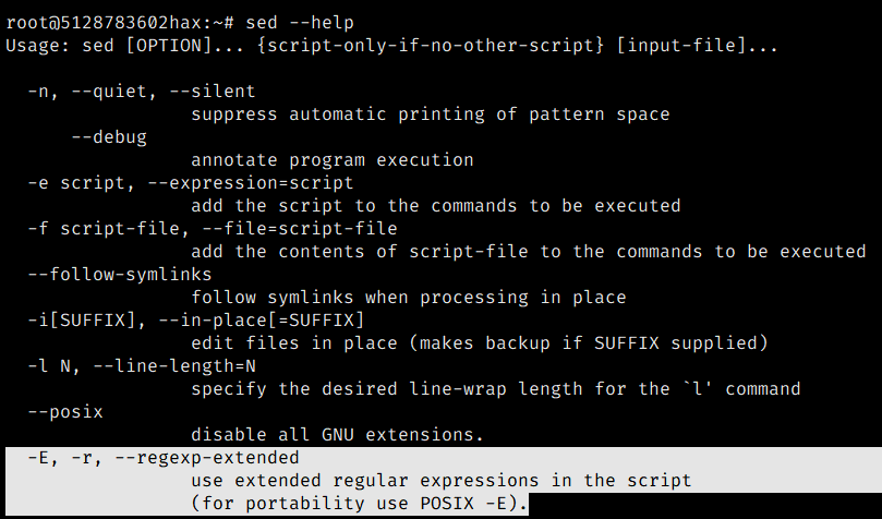-E, -r, --regexp-extendeduse extended regular expressions in the script(for portability use POSIX -E).