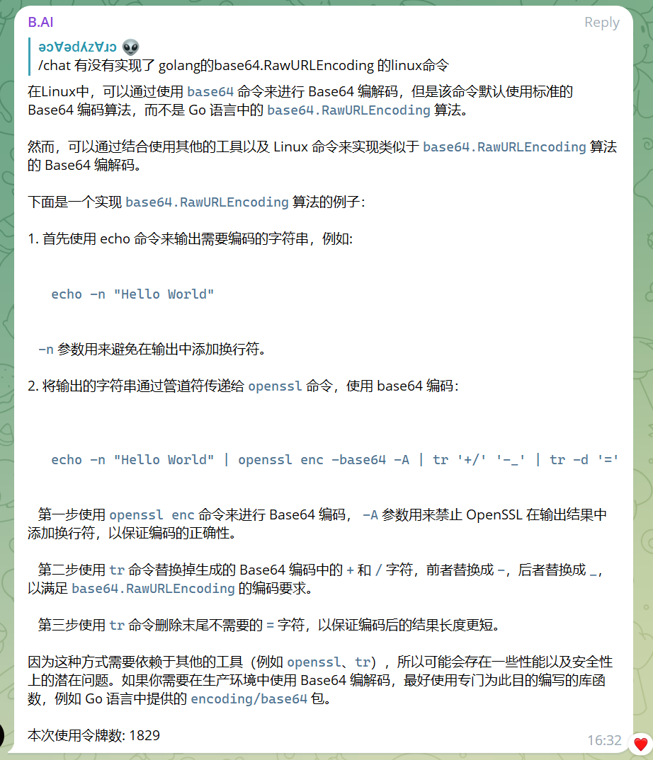 因为这种方式需要依赖于其他的工具(例如 openssl、tr),所以可能会存在一些性能以及安全性上的潜在问题。如果你需要在生产环境中使用 Base64 编解码,最好使用专门为此目的编写的库函数,例如 Go 语言中提供的 encoding/base64 包。