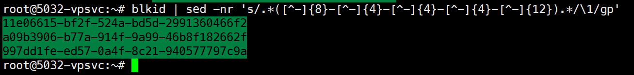 blkid | sed -nr 's/.*([^-]{8}-[^-]{4}-[^-]{4}-[^-]{4}-[^-]{12}).*/\1/gp'
