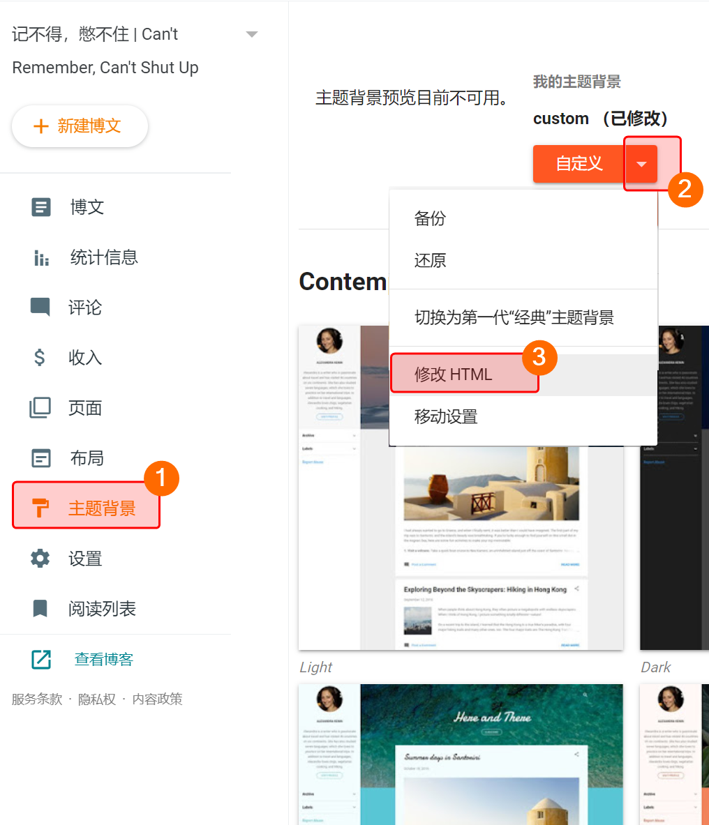 把复制下面的代码.打开blogger后台, 主题背景 - 自定义 - 修改HTML