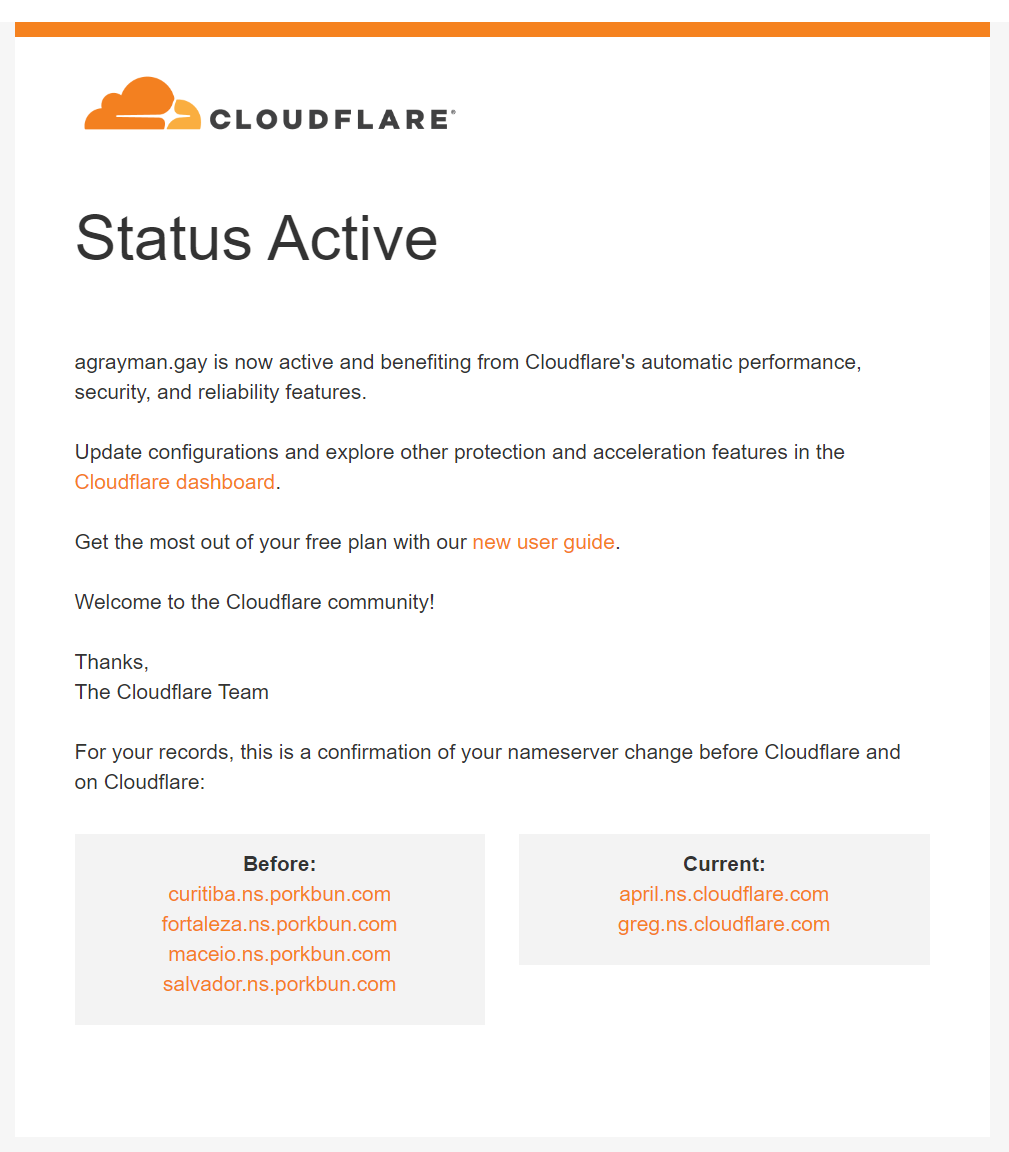 当Cloudflare检测到你设置好了以后,你会收到一封邮件,如下: