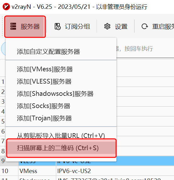 保持二维码露出,在v2rayN中选择菜单 扫描屏幕上的二维码