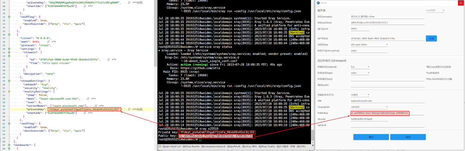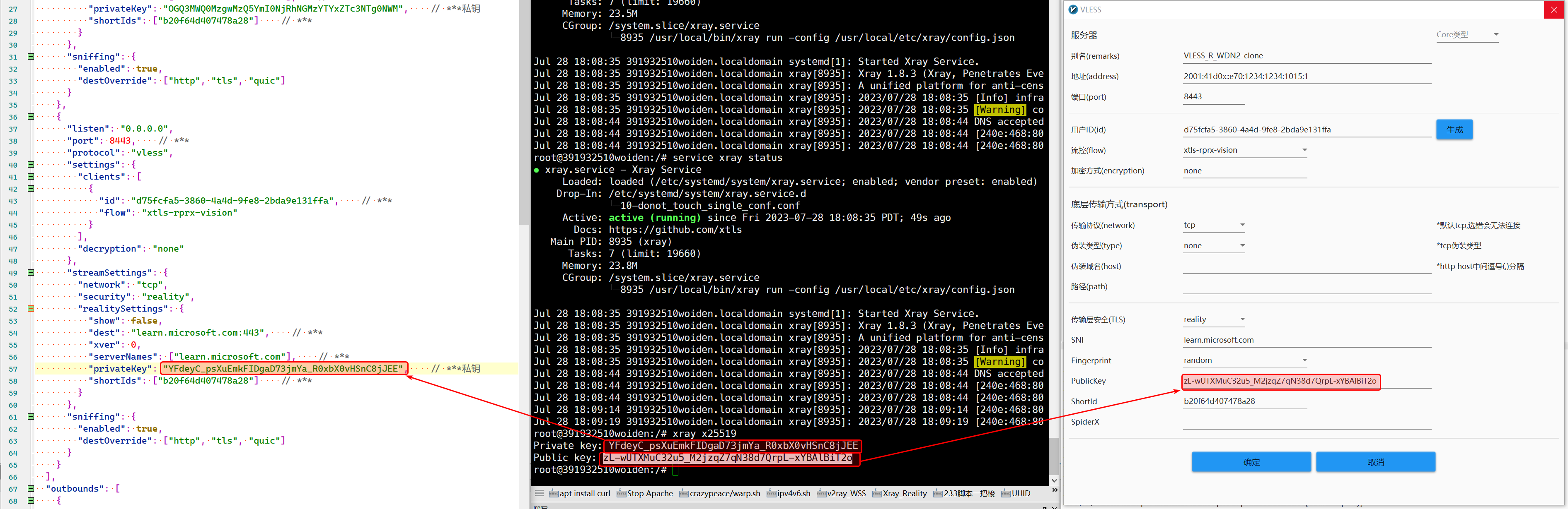 把私钥设置到 config.json 配置文件, 把公钥设置到v2rayN节点信息.