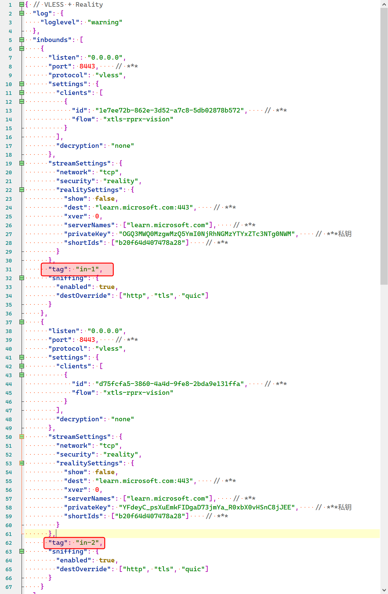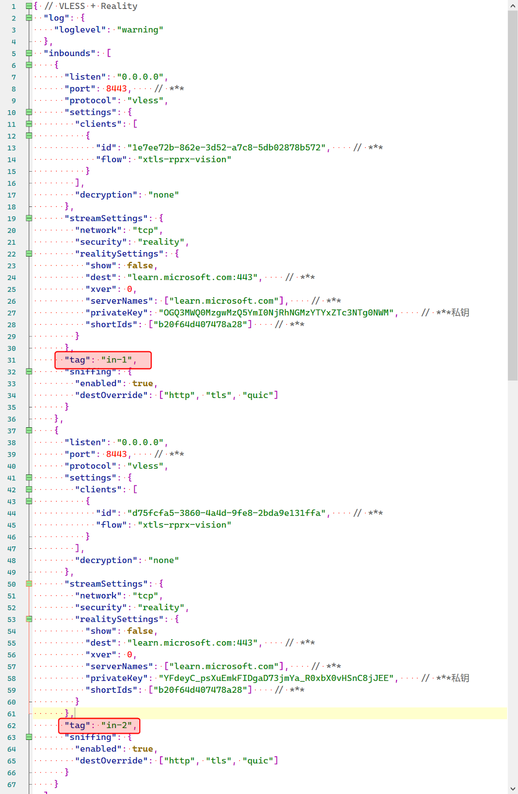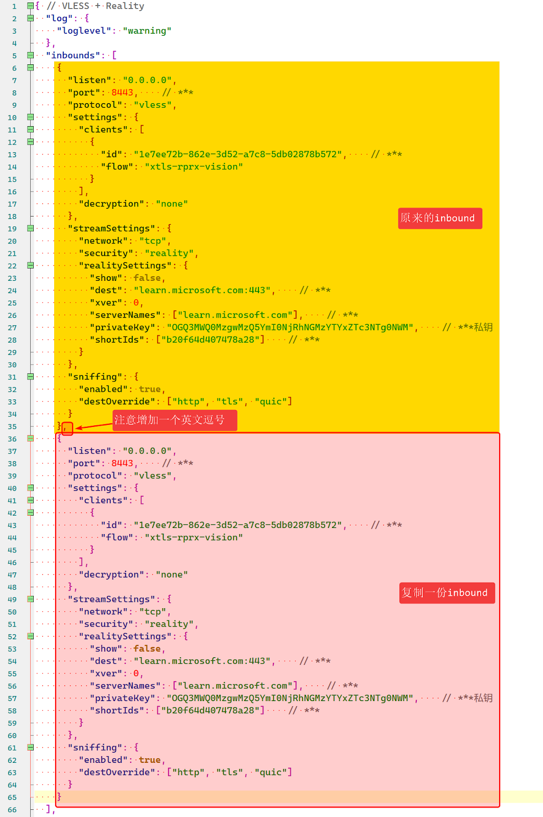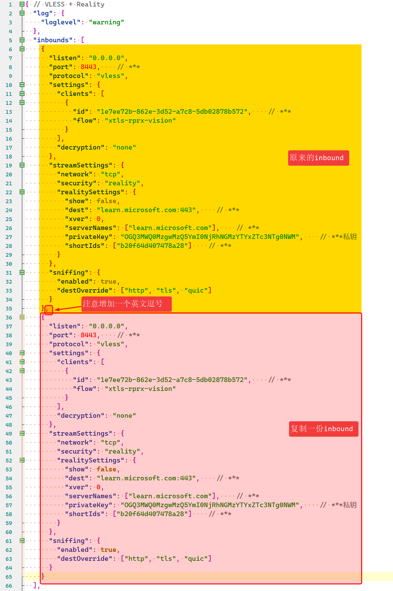 我们要做的就是把中间的这一对 {} 复制一份, 接在原来的 那一对 {} 下面, 一起放在 inbound的这一对 [] 里面.