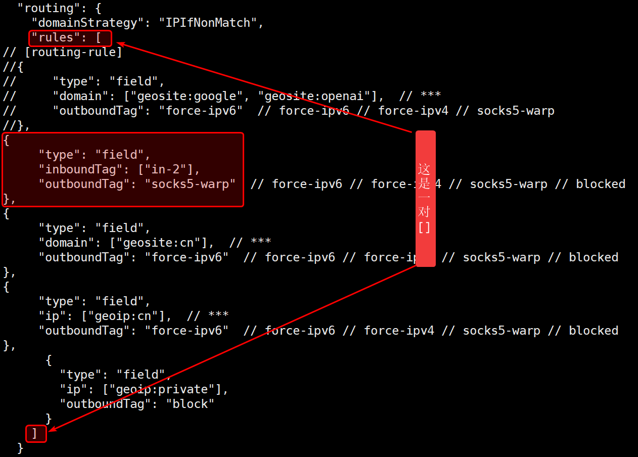 找到config.json配置文件中的"routing", 再找到其下的"rules". 注意观察 "rules" 是一对 []. 我们在里面添加一对{} 如下:
