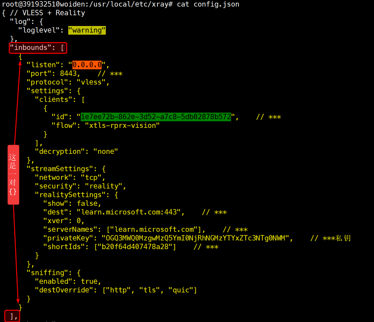 注意看inbound的结构, 是用一对 [] 包起来的一对 {}