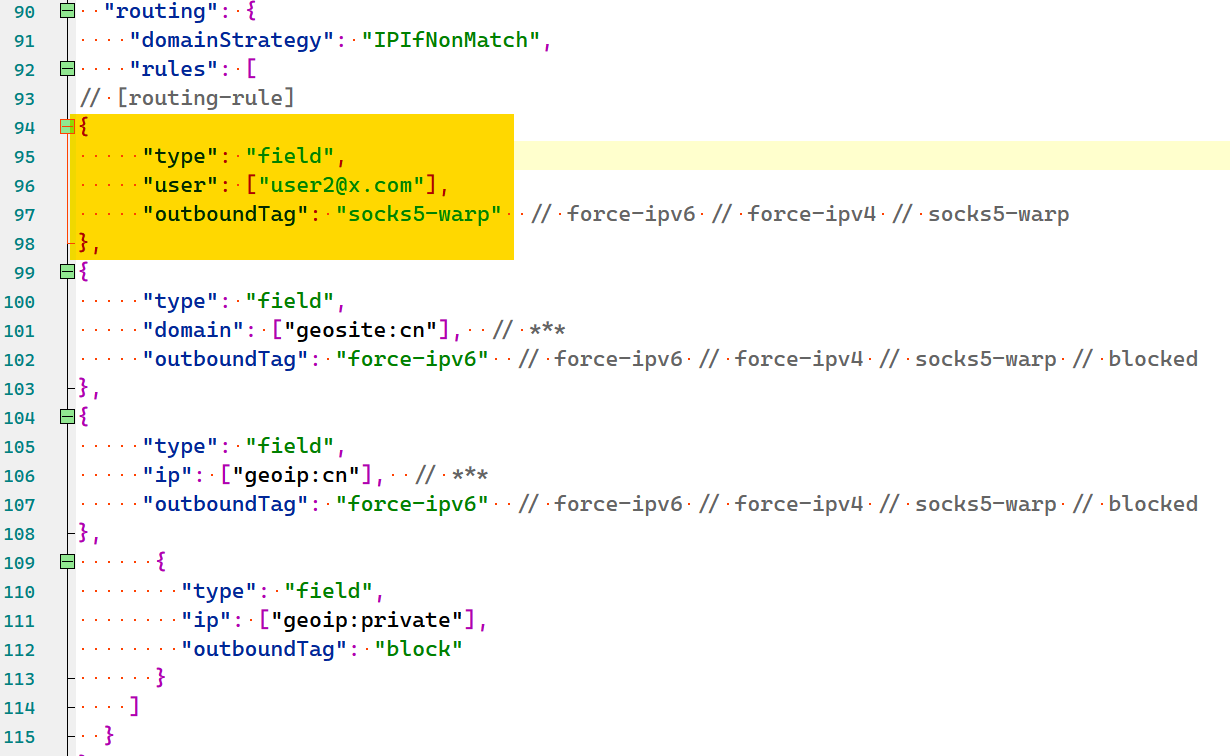 {"type": "field","user": ["[email protected]"], // 这里写某个client的email"outboundTag": "socks5-warp" // 这里写outbound的tag},