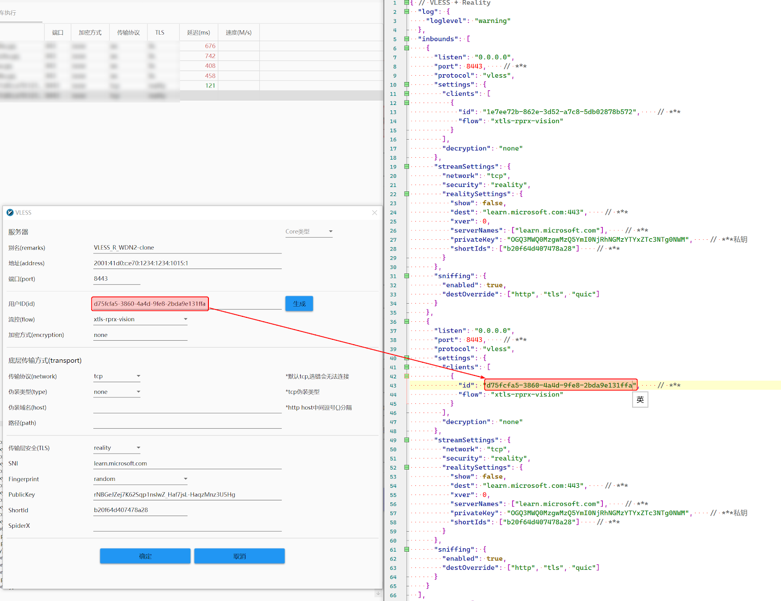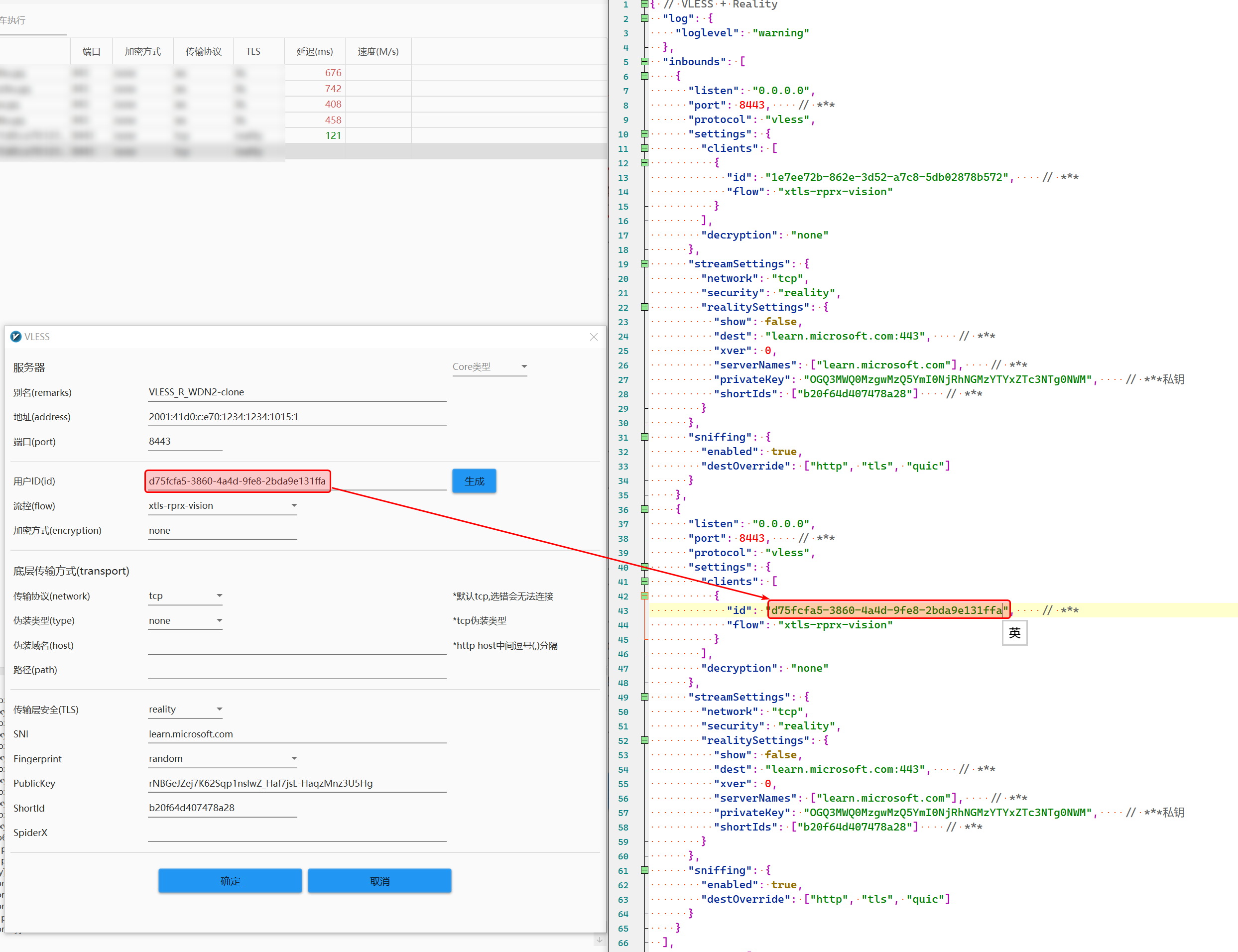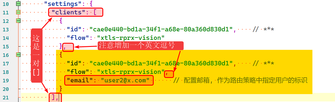 注意看clients结构, 是用一对 [] 包起来的一些 {}. 你用一键脚本跑出来的配置文件应该只有一对{}, 你把它复制一份, 接在原来的{}下面, 一起放在 inbound的这一对 [] 里面. 而且因为JSON格式, 这两对 {} 之间要用逗号分开.