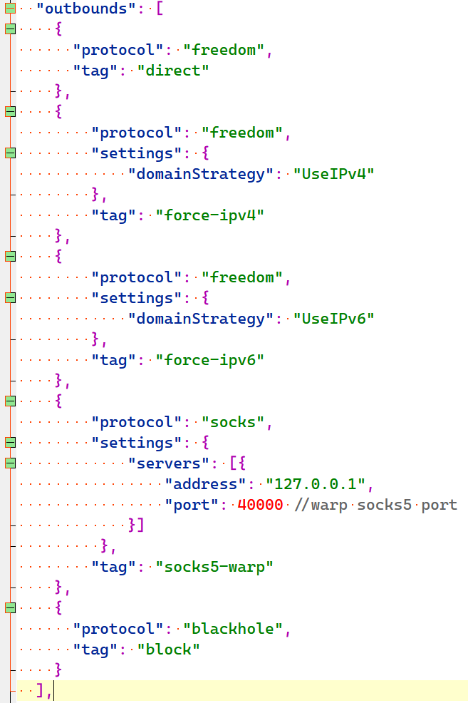 {"protocol": "socks","settings": {"servers": [{"address": "127.0.0.1","port": 40000 //warp socks5 port}]},"tag": "socks5-warp"},