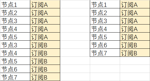 再去看订阅A和订阅B里面就会有节点被去掉了, 比如, 订阅B里面节点 3 4 5 没有了, 只剩节点 6 7 了.