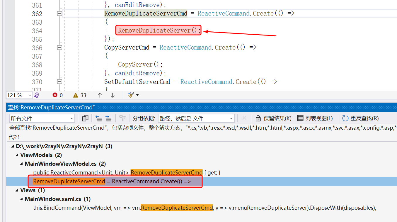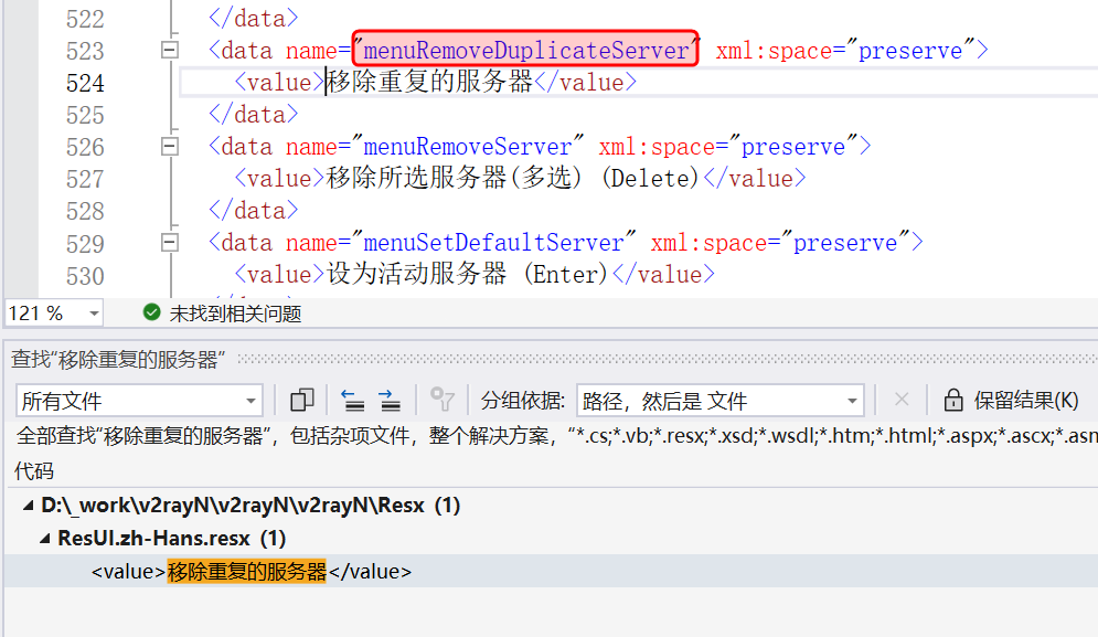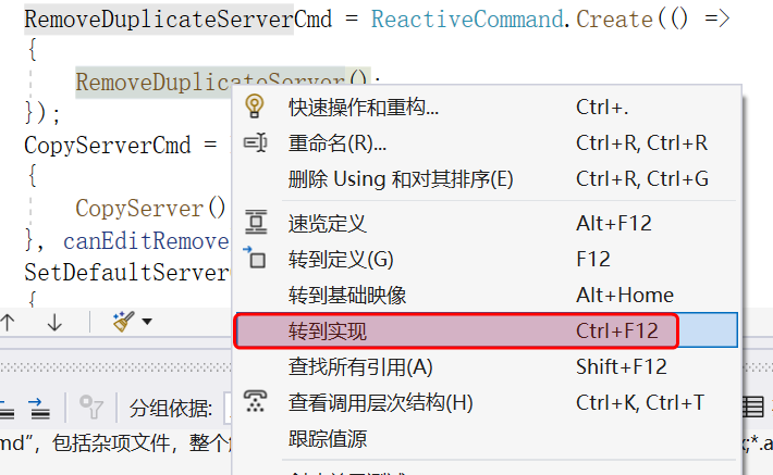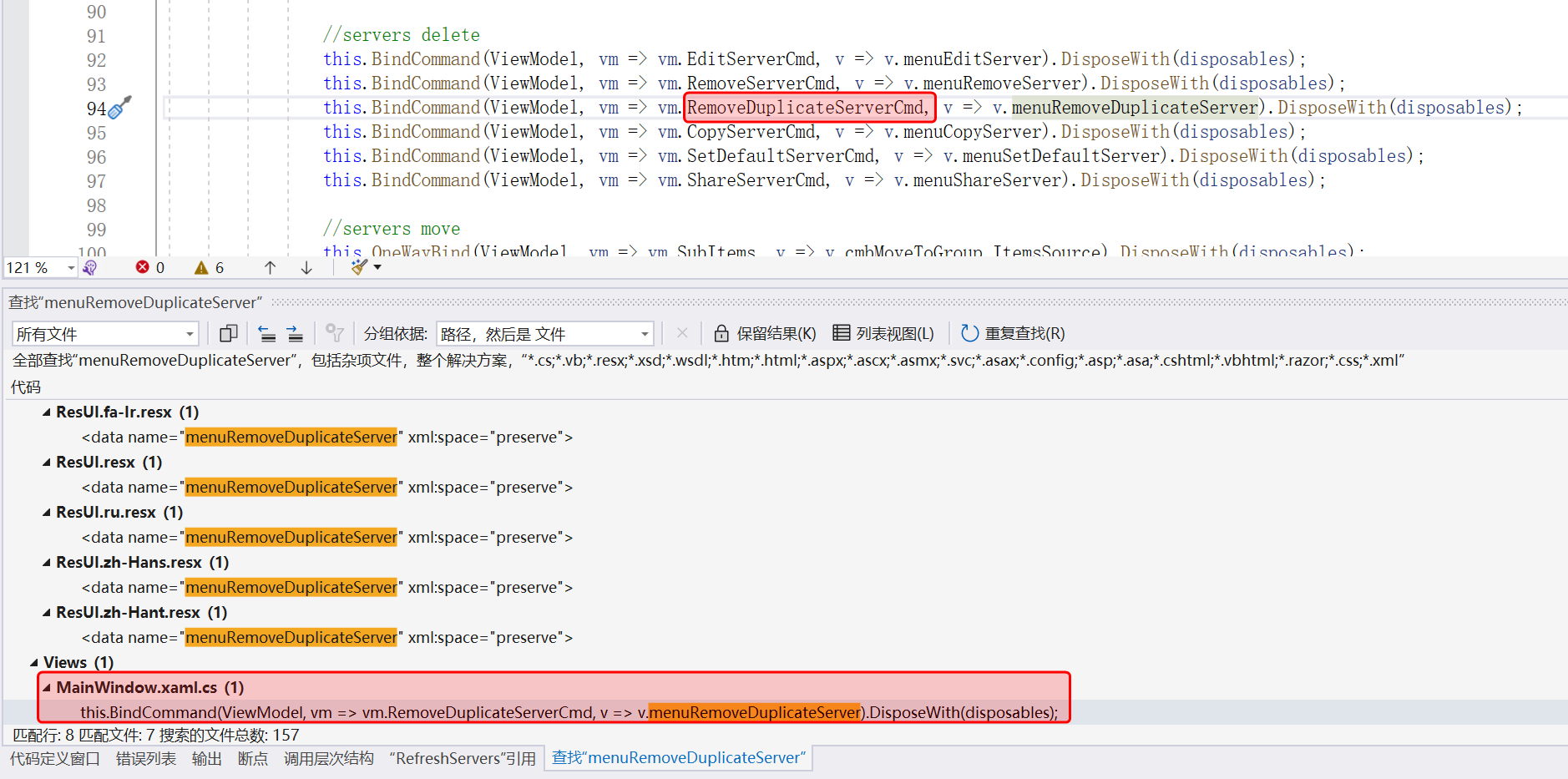 找到这个资源文件Ctrl+Shift+F 在项目中搜索这个资源的ID menuRemoveDuplicateServer 找到这样一个绑定关系继续全项目搜索 RemoveDuplicateServerCmd 得到这个结果