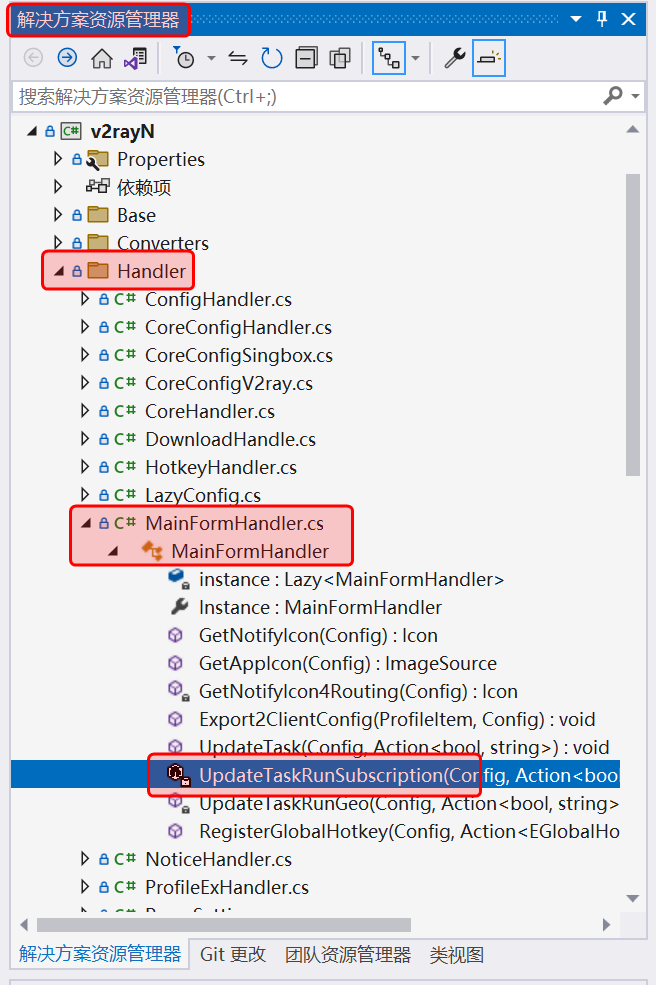 把搜索到的地方都点开看一下, 找到实现定时器的逻辑在 MainFormHandler.cs 文件中 UpdateTaskRunSubscription 函数.如果你是直接在解决方案管理器中找, 那么位置在这里:这个函数里面写的什么意思呢? 我们找 GPT 问一下. 提问内容就是"帮助我理解以下代码", 接着就把函数全部粘贴, 回车.