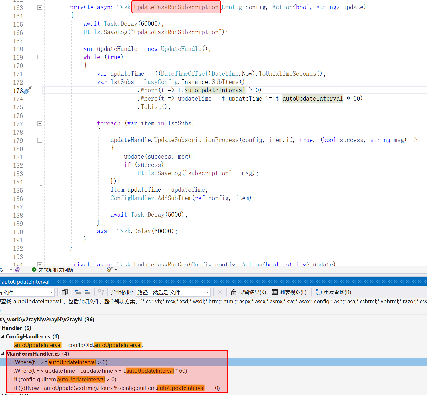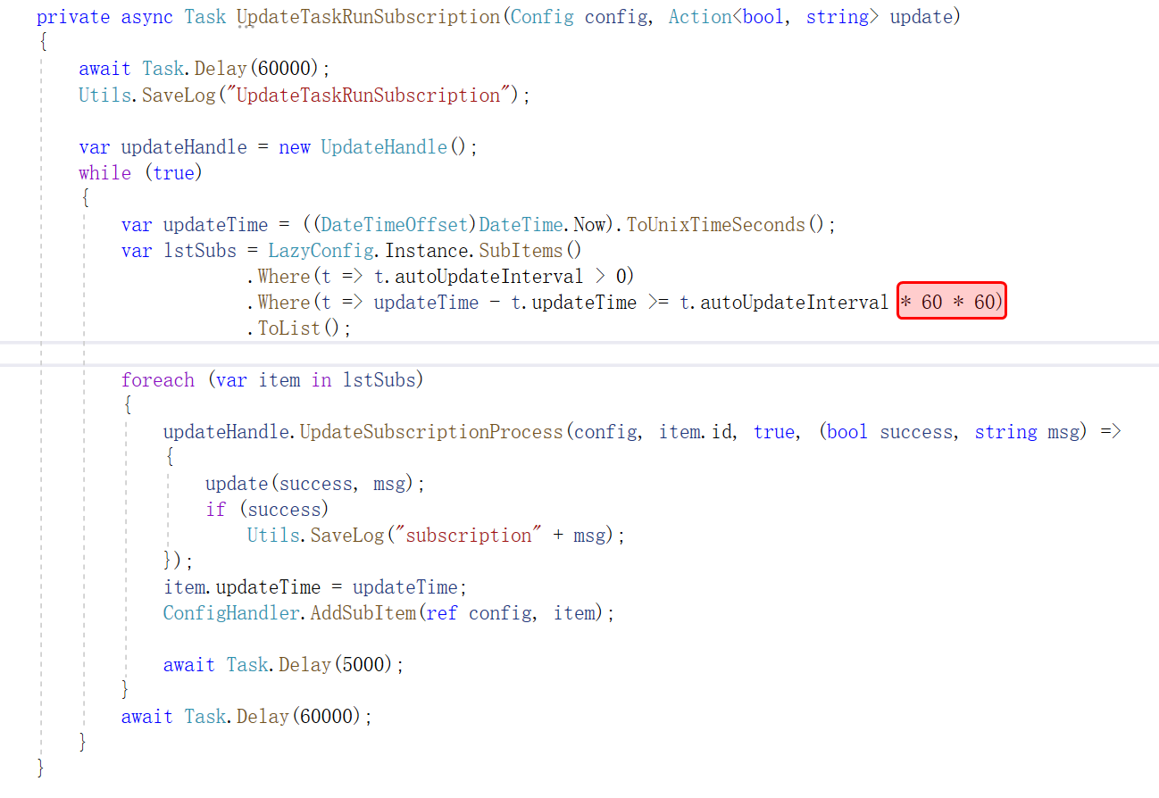 这段代码是一个异步方法 UpdateTaskRunSubscription,它接受两个参数:config 和 update,并返回一个 Task 对象。代码的主要逻辑如下:1. 等待 60 秒(60000 毫秒)。2. 调用 Utils.SaveLog 方法,将日志信息写入日志文件,日志信息为 "UpdateTaskRunSubscription"。3. 创建一个 UpdateHandle 对象。4. 进入一个无限循环。5. 获取当前时间的 Unix 时间戳(以秒为单位),存储在 updateTime 变量中。6. 获取 LazyConfig.Instance.SubItems() 的列表,并进行一系列筛选操作:- 筛选出 autoUpdateInterval 大于 0 的项。- 筛选出满足条件 (updateTime - t.updateTime) >= t.autoUpdateInterval * 60 的项。- 将筛选结果存储在 lstSubs 列表中。7. 遍历 lstSubs 列表中的每一项:- 调用 updateHandle.UpdateSubscriptionProcess 方法,并传递参数 config、item.id、true 和回调函数 (bool success, string msg) => { ... }。- 如果回调函数中的 success 为 true,则调用 Utils.SaveLog 方法,将日志信息写入日志文件,日志信息为 "subscription" + msg。- 更新 item 的 updateTime 属性为 updateTime。- 使用 ConfigHandler.AddSubItem 方法,将 item 添加到 config 中。- 等待 5 秒。8. 等待 60 秒。9. 重复步骤 5 到步骤 8。简单来说,这段代码的作用是在一个定时任务中循环执行一些操作。首先等待一段时间,然后根据一些条件从配置中获取需要更新的订阅项。接着遍历每个订阅项,执行订阅更新的操作,并更新相关的记录和配置。然后等待一段时间,再次重复这个过程。