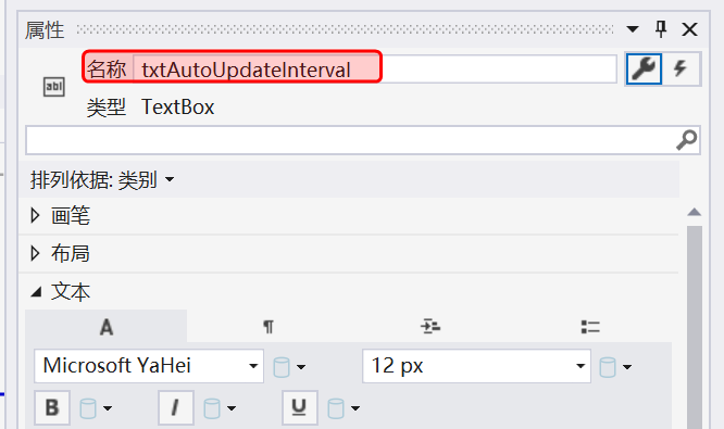 在右边的 属性窗口 中找到界面元素的ID为 txtAutoUpdateInterval