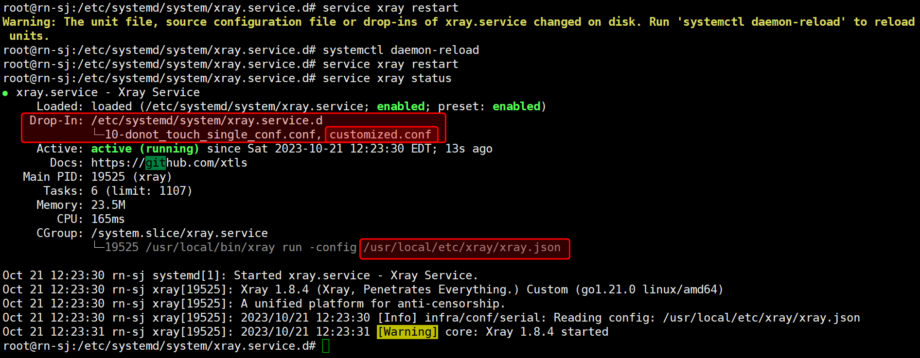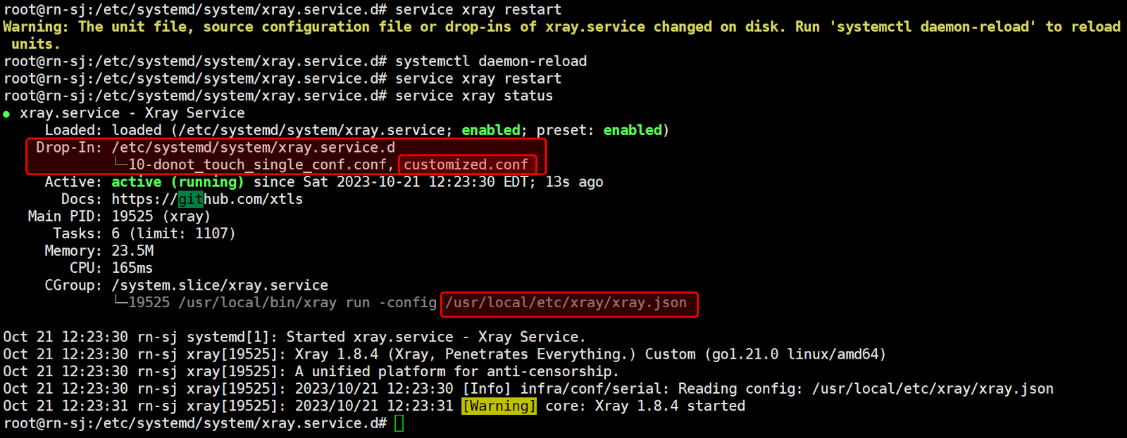然后再查看服务状态, 发现启动命令使用的是我们期望的 xray.json , 也看到了 Drop-In 了我们新增的 customized.conf 文件.