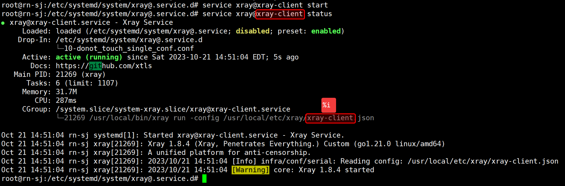 所以整个逻辑是这样的, 我们执行 service xray@xray-client start 的时候, 应用的是 [email protected] 这个模板(template). 然后 xray-client 被认为是 实例(instance).