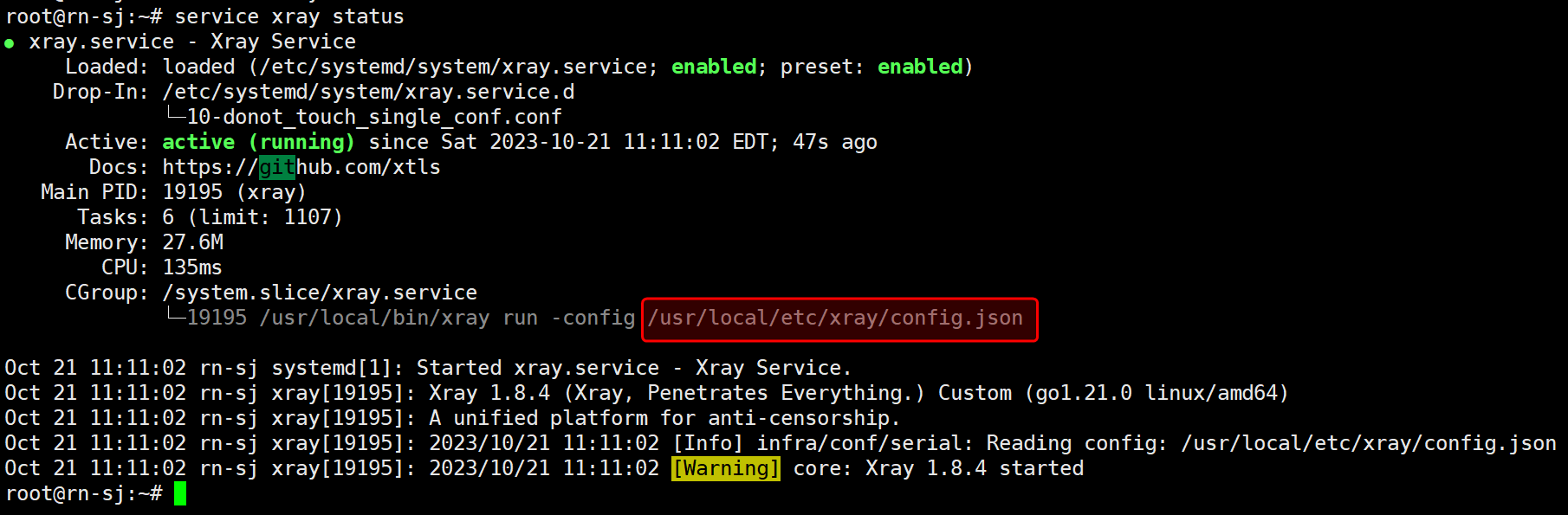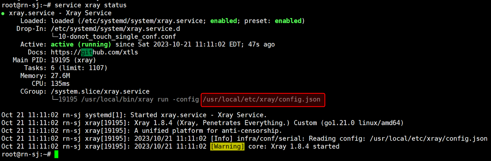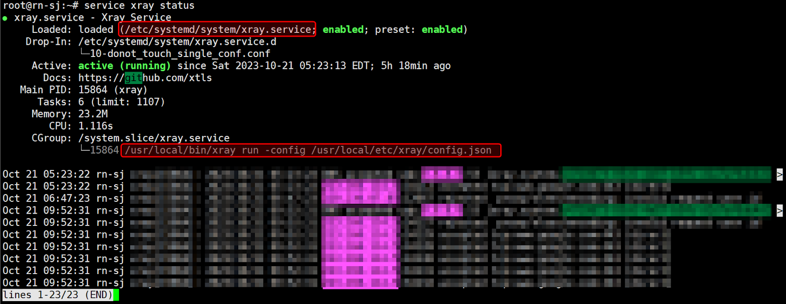 在 service xray status 中, 看到了加载的 service 文件. 也看到了实际运行的命令.