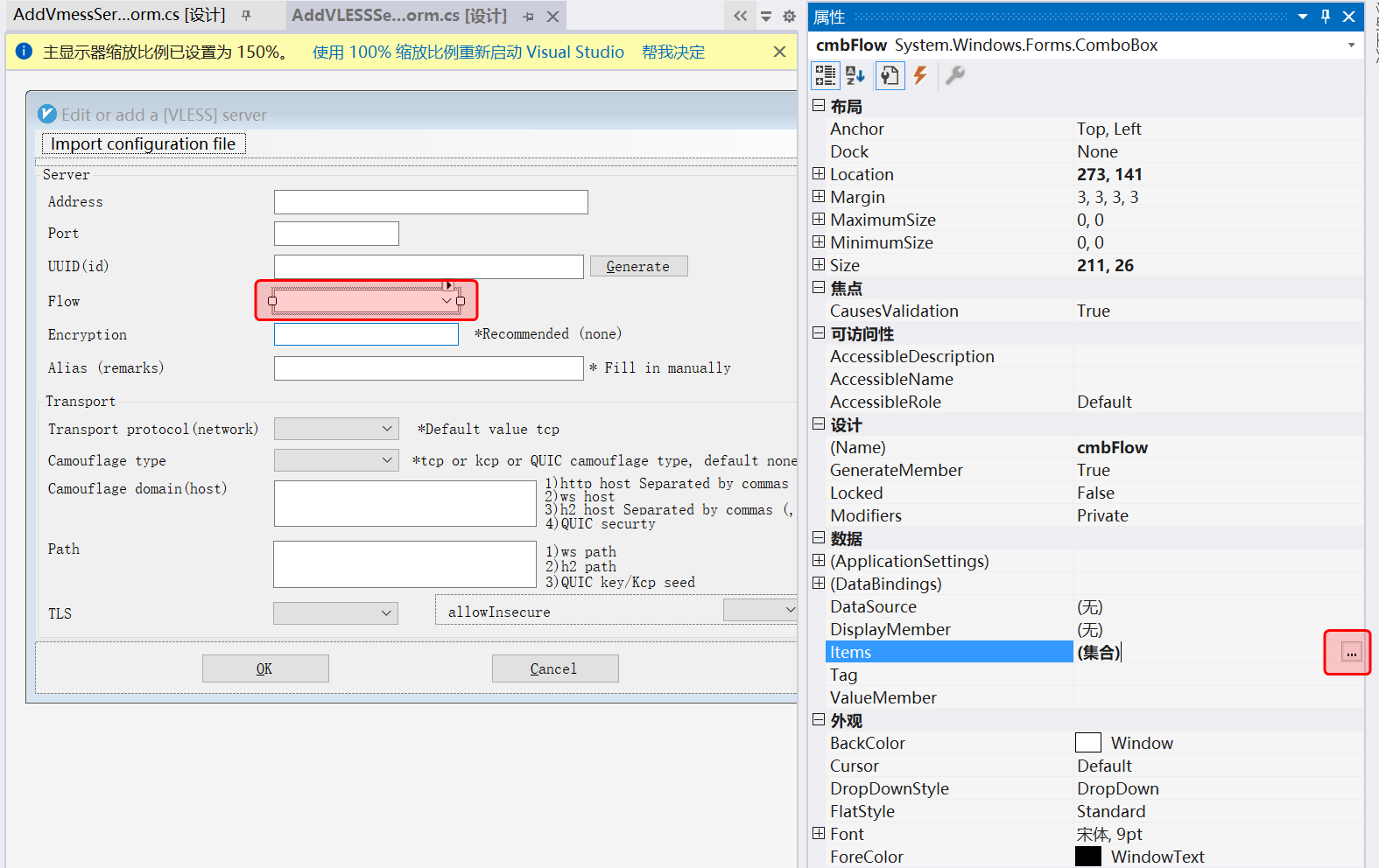 选中 Flow 下拉框, 在属性窗口中找到 Items, 点击 "..." 按钮
