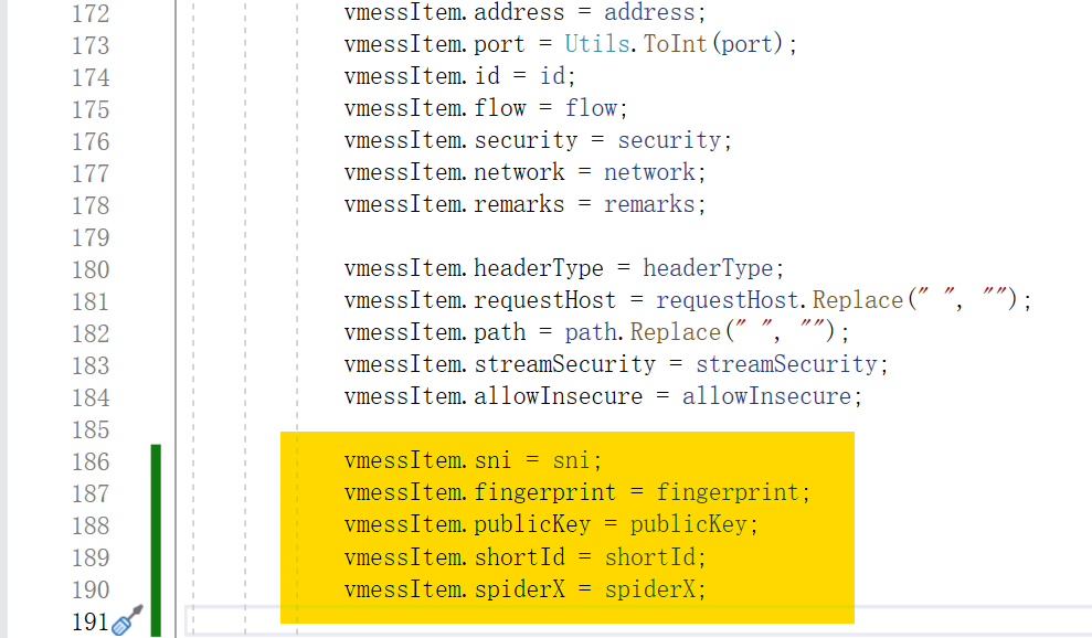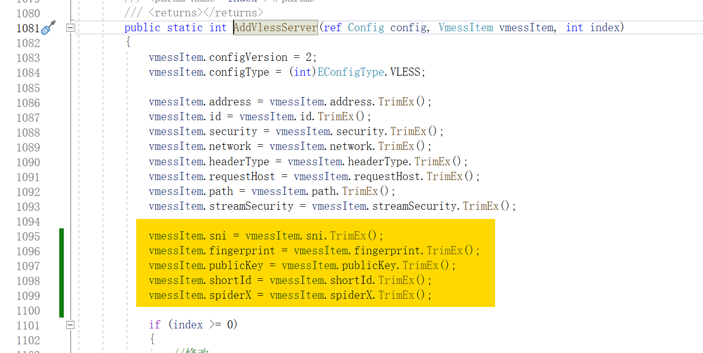 这里一路追下去, ConfigHandler.AddVlessServer 函数中要添加 Reality 相关参数的处理.