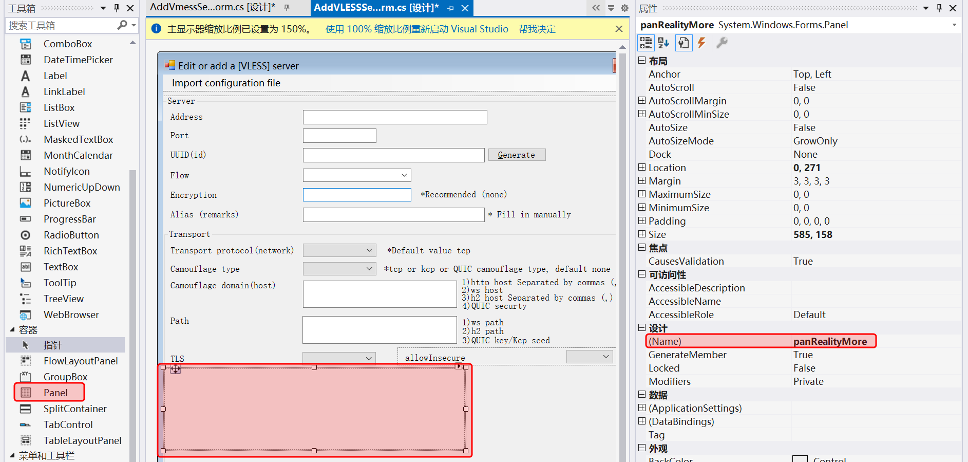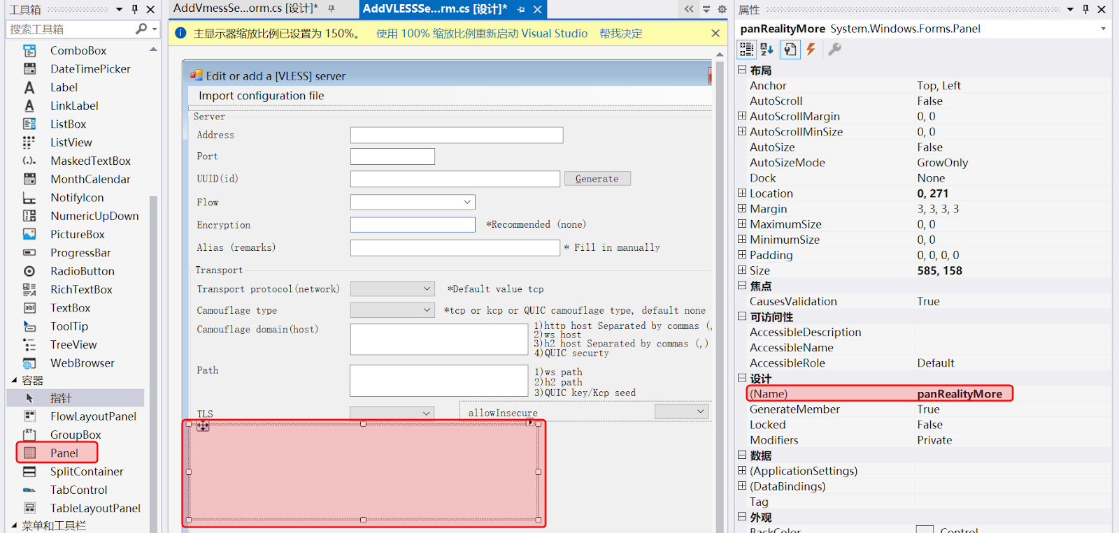找到控件窗口, 拖放一个 Panel 控件到VLESS服务器窗口上. Name 属性设置为 panRealityMore